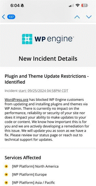 The most significant blow came later on September 25th. WordPress.org announced that it was banning WP Engine from accessing its resources. This meant WP Engine customers would no longer be able to directly update or install plugins and themes through the official WordPress repository, a critical security and functionality feature.