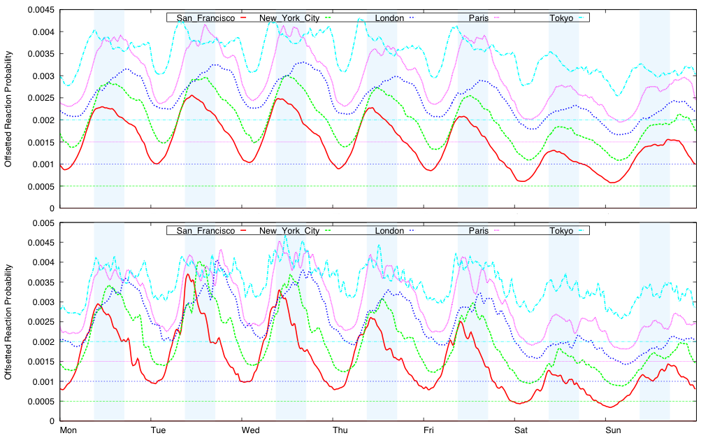 Chart shows likelihood of response to posts on Facebook (top) and Twitter (bottom) throughout the week (click on chart to enlarge).