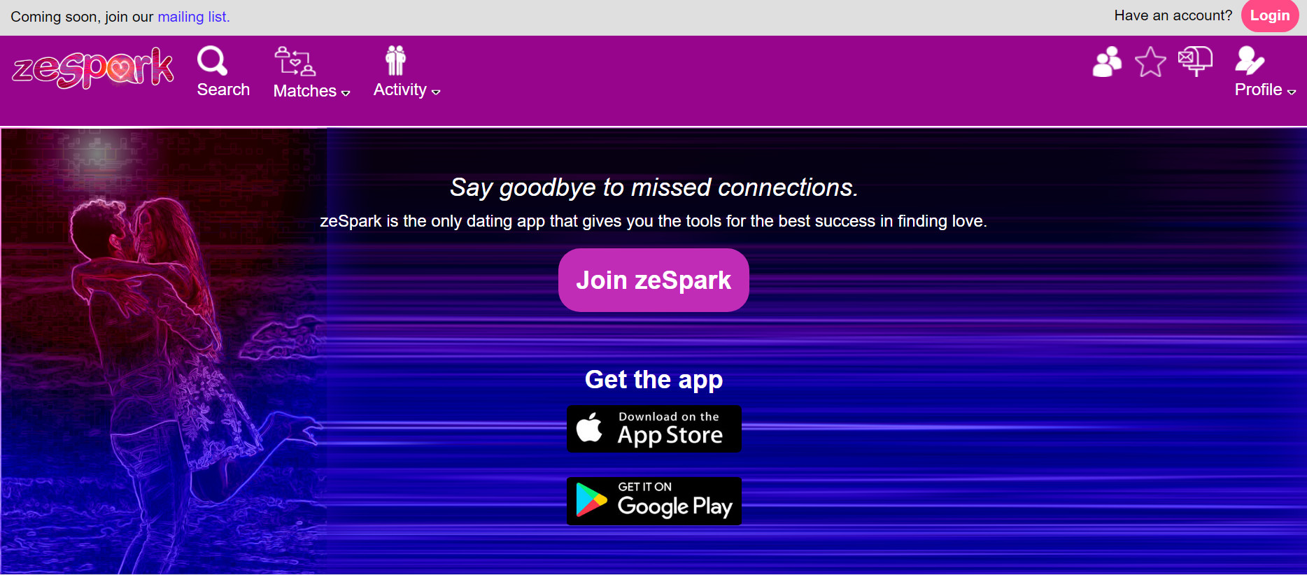 The top menu items, Search, Matches, Activity, and Profile, have images displaying on top of the menu tabs text. And there are two menus displaying on the website, one on the left consisting of the Search, Matches, and Activity tabs, and one on the right consisting of the Profile tab.