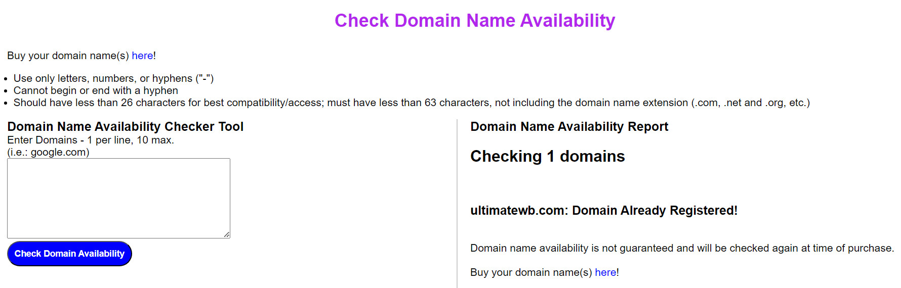 Choose a memorable domain name that reflects your website’s purpose. You can check if your domain name is available or already registered by someone else by using the UltimateWB Check Domain Name Availability Tool.