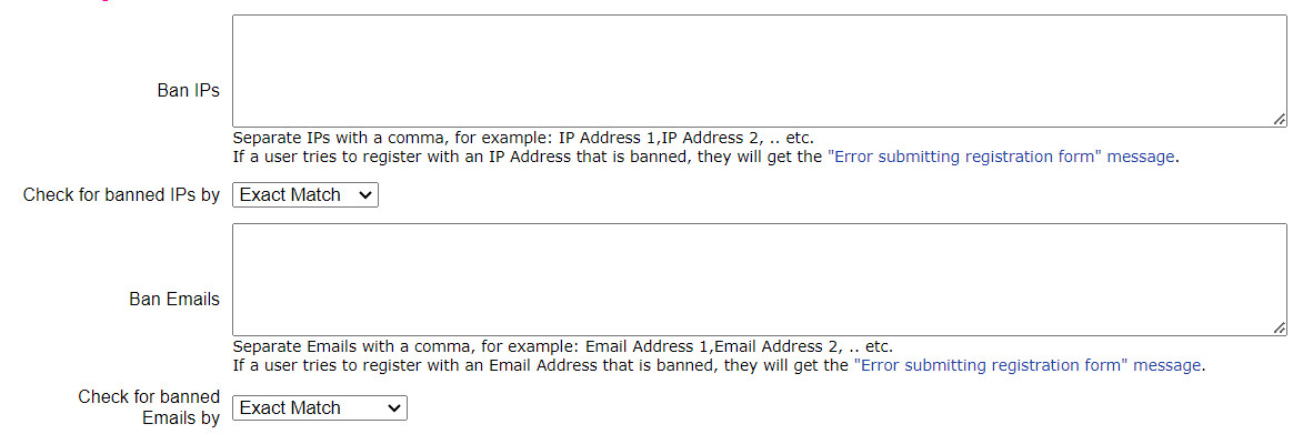 Just enter the IPs you want to block from registering as a member on your website, separating each with a comma. You can block member registrations by email addresses. And also choose to ban by exact matches, or by any part of the IP or email address. If a user tries to register with an IP address or email address that is banned, they will get the “Error submitting registration form” message – which, like other language phrases, you can customize on your admin panel.