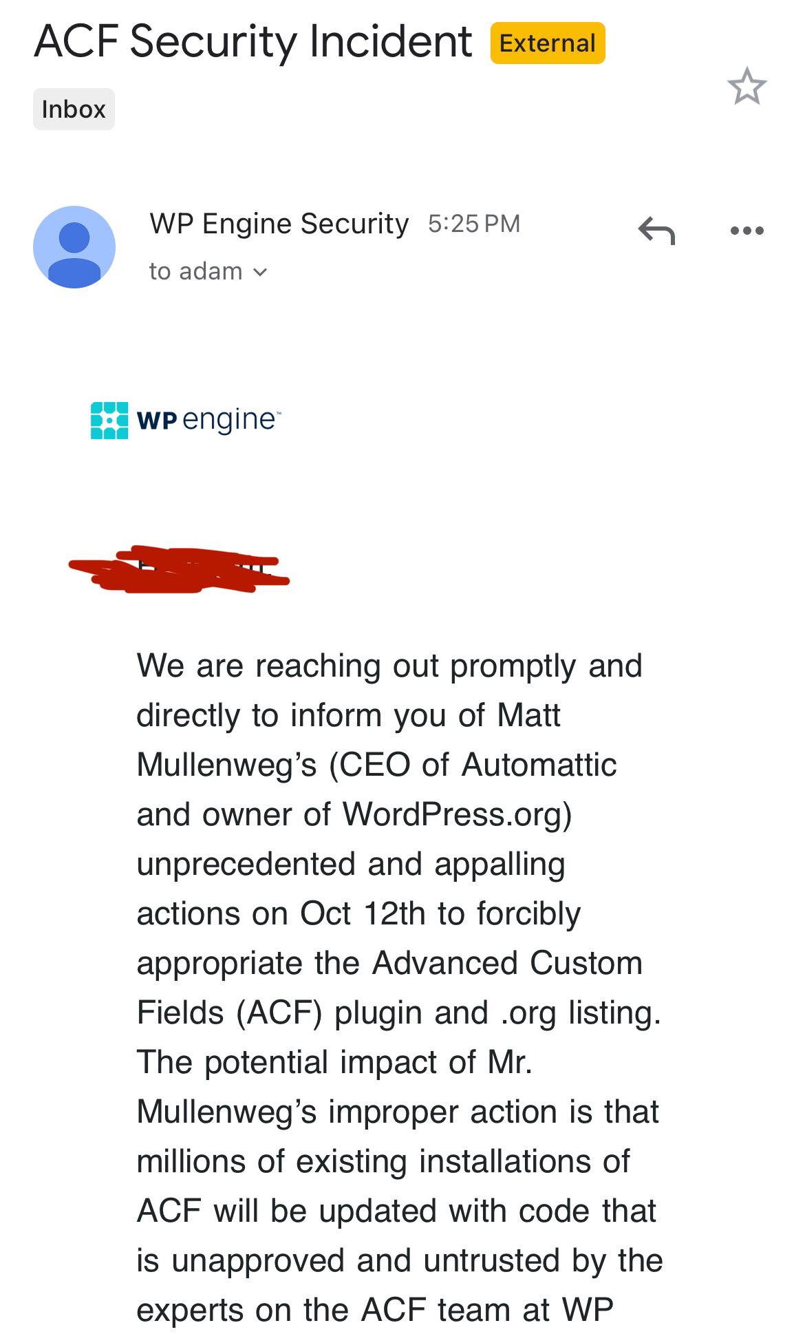 We are reaching out promptly and directly to inform you of Matt Mullenweg’s (CEO of Automattic and owner of WordPress.org) unprecedented and appalling actions on Oct 12th to forcibly appropriate the Advanced Custom Fields (ACF) plugin and .org listing. The potential impact of Mr. Mullenweg’s improper action is that millions of existing installations of ACF will be updated with code that is unapproved and untrusted by the experts on the ACF team at WP Engine. We want to highlight how you can immediately reduce your exposure and risk now, and ensure you are using the genuine ACF. If your website is hosted on WP Engine or Flywheel or you are an ACF PRO customer – you are not impacted and do not need to take any action. You will continue to get the latest updates, securely from the experts on the ACF team.