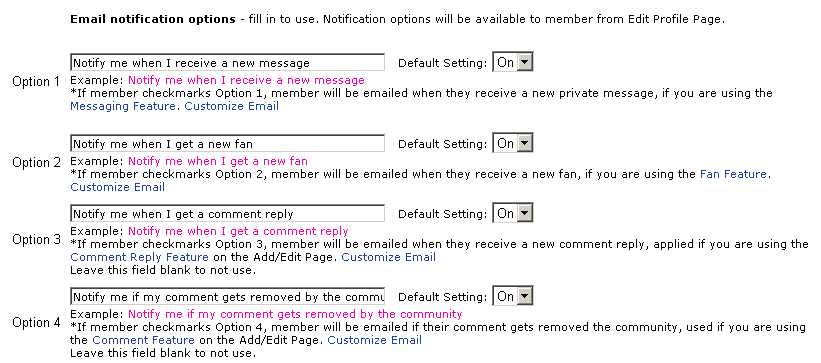 To turn on a notification, make sure the Option text box is filled in, and then you can also choose the Default Setting to be On or Off. Members will be able to customize their notification settings from their Edit Profile page.