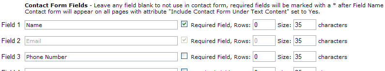 To Configure your Contact Form go to Configure Site > Basic Setup, Contact Form section, and fill-in/edit the configuration settings. Leave any field blank to not use in the contact form, mark which fields should be required fields and they will be marked with a * after the Field Name (plus a check if they are filled in after user clicks the Submit button) - you choose the Field Names. Optionally add a menu to the form and allow file attachment uploads too.