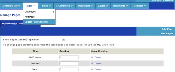 You can change the order of the page links at any time - the order of the Top Level page links, sublevel links, and footer links. Go to the Pages > Update Page Ordering. tab By default, this page will display the top level pages. To order another group of links, choose from the "Show Pages Under" menu. You may order the pages by clicking on the "Up" / "Down" links next to each page title, or by entering in a position value in the text field next to each page title, and then clicking the "Save" button at the bottom.