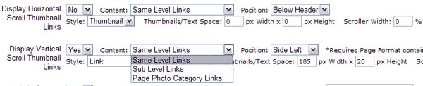 To choose to display a Horizontal or Vertical Scroll choose "Yes" in its respective section, on the Add Page/Edit Page. You can choose the position for the scroller to appear. For the Vertical Scroll, make sure to choose a format that consists of the Side Left or Side Right section, depending on the Position of the Scroll you choose. Also make sure to choose a vale greater than 0 for the Width x Height for the Thumbnails/Text Space.