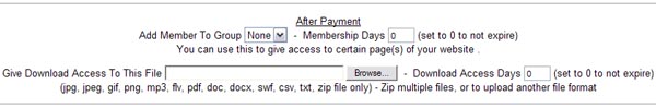 You can choose a member group to add the customer to after payment and the membership days - set this to 0 to not expire. You can use this to provide access to certain page(s) of your website to the member after payment. Also, you can choose to give Download Access to a file after payment, and choose the number of download access days - set this to 0 to not expire. You can upload this Download Access File directly here; you can zip multiple files. Members get a list of File Downloads they have purchased and access to on their Profile Page, Downloads section.