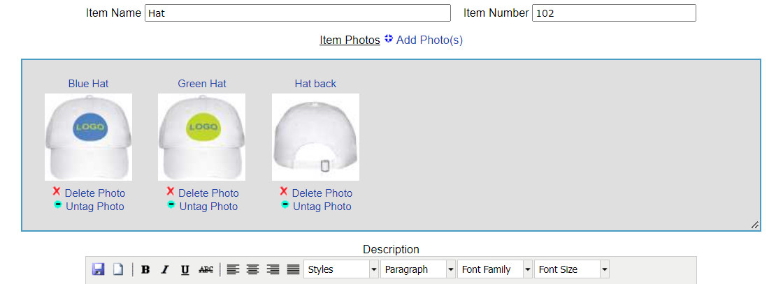 To add photos to an Item: Upload the photos first (refer to Photos App: "Upload Photos For Your Website").