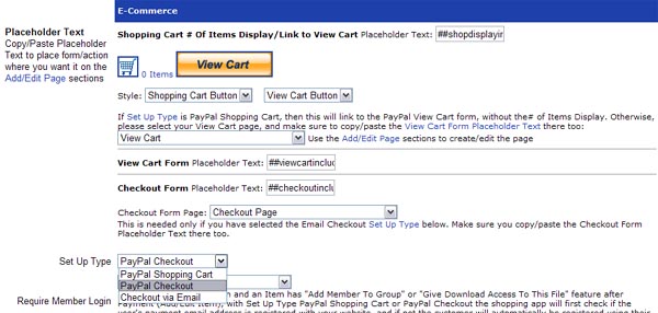 To start setting up e-commerce on your website, go to the Configure Site > E-Commerce section. At the top of this section are the Placeholder Text codes for adding a Shopping Cart # Of Items Display/Link to View Cart to your website, adding a view cart form to a selected page, and adding a checkout form to a selected page of your website. Just copy/paste the Placeholder Text where you want the respective items to display. Configure & customize your shopping cart and user shopping experience here too, such as the type of shopping cart/checkout to use, whether to require member login to shop or checkout, or to use an Affiliates program to offer commission on referral sales, and how to process customer reviews. You can even customize your shopping cart buttons and language phrases.