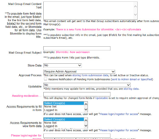 On this page you can customize the form/survey, such as how you want to process the form, if you want to save the submitted form data in the database, who can submit the form/how many times, who can access the data, etc., and language phrases.