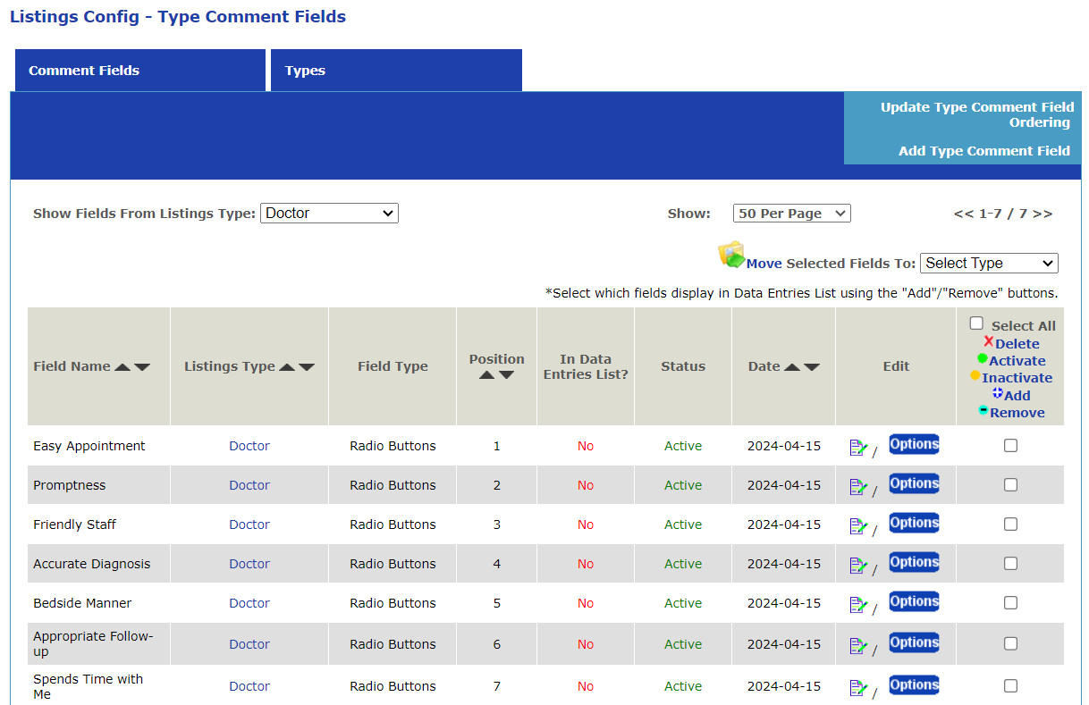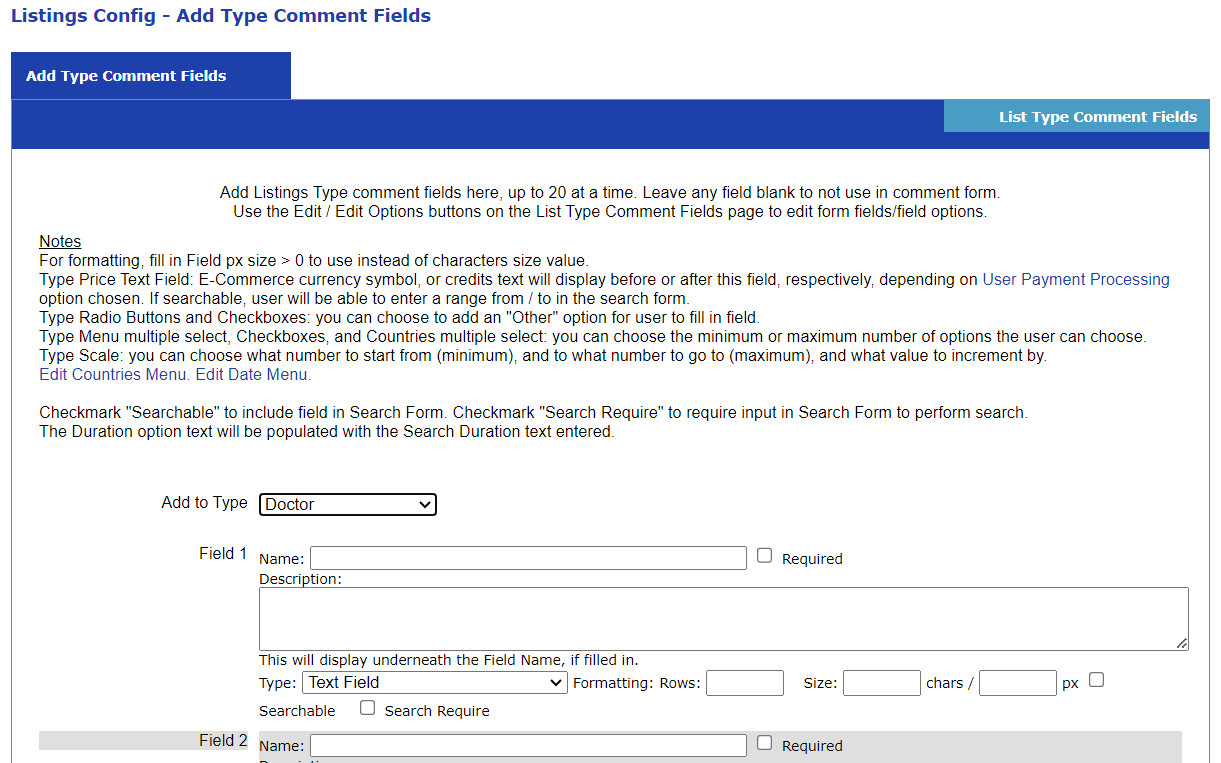 This will take you to the list of comment fields for each Listing type: