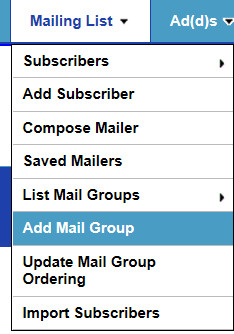 To create Mail Groups, go to the Mailing List > Add Mail Group tab. Fill out the form and then click the "Add Mail Group" button. On the List Mail Groups page you can get the list of curent Mail Groups, and click on the edit icon on each Mail Group row to edit it.