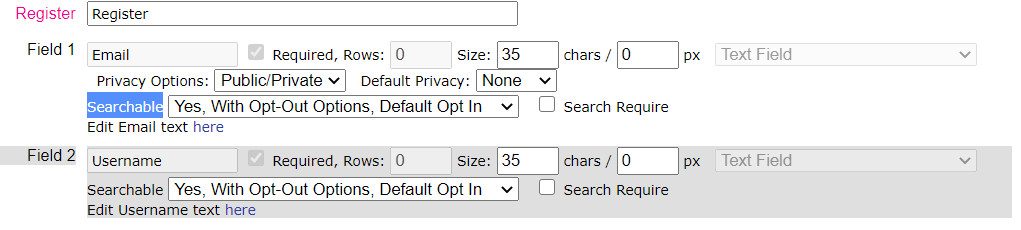 There are 20 Registration Fields available to customize by default here. To make a field searchable, you just select that option from the "Searchable" menu for each field.