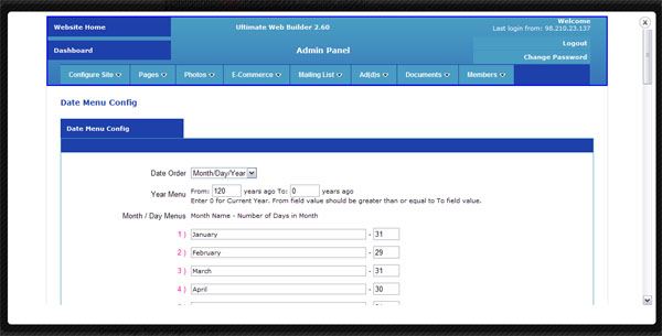 Click on the link "choose Date Order/Phases here" to choose the date order and customize date phrases. The page will open as a page overlay, so you will not lose changes you make on the Configure Site > Social Networking page by clicking on the link.