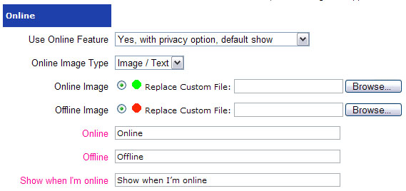 In the Online section of the Configure Site > Social Networking page, you can choose to use the Members Online feature, whether to use it by default, and whether to allow members to choose their privacy setting for showing whether they are online or not. Like other features, you can choose the images to display for a member online / offline, and how to display the online/offline image/text.