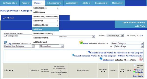 Photos that are added to a Photo Category are used for the Photo section of a page, and also for photo galleries/slideshows (refer to Adding Photos / Slideshows / Photo Galleries To Page Photo Section).