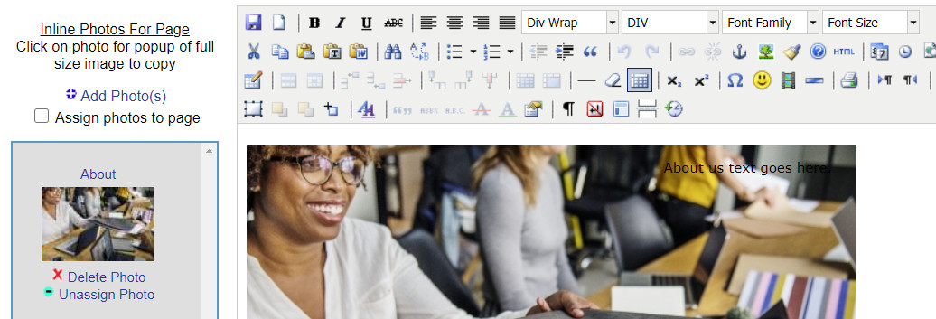 Photos that are added to a page (called Inline Photos) may be added to the text section of a page on the add/edit page - they are listed on the left side column of the text editor section (refer to Adding Inline Photos).