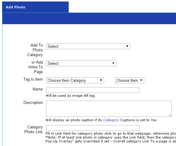 On the Add Photo page, choose either a Photo Category to add the photo(s) to, or a Page. You can also tag a photo to an e-commerce item, by choosing the item name from the Tag To Item drop down menu here.