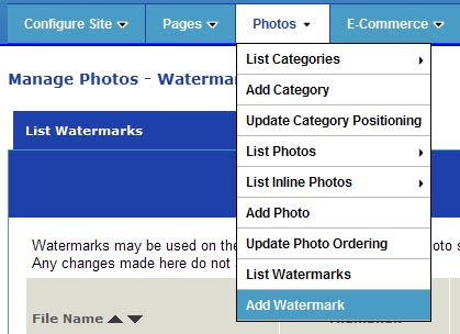 You can manage watermarks under the Photos > List Watermarks tab. In order to use the watermarking feature on the List Photos pages, you will need to upload your watermark first. When watrmarking from the Add/Edit Photo pages, you can upload your watermark on that same page directly, and it will be added to your list of watermarks if you have checkmarked the "Save watermark in Admin Panel" option.
