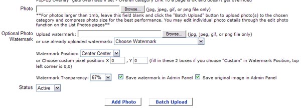 Choose the watermark transparency percentage and the watermark position on the photo(s). You can Batch Watermark photos on the Add Photo page when using the Batch Upload button, and also on the List Photo pages.