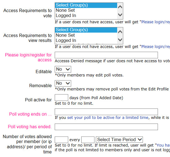 On this page you can customize the poll, such as how long you want poll voting to be open, who can vote/how many times, who can access the poll results and when, i.e. after voting only, or when poll voting ends, etc., and language phrases.