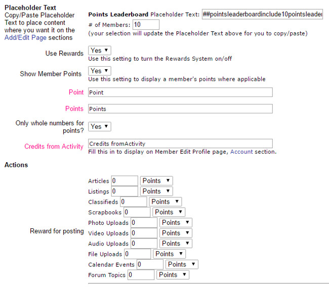 Here you can customize the Language & Phrases, such as want you want to call Points, and the configurations. Reward members for posting, viewing, commenting, liking, and sharing posts within your website, integrated in the Articles, Listings, Classifieds, Scrapbooks, Photo Uploads, Video Uploads, Audio Uploads, File Uploads, Calendar Events, and Forum apps. Choose whether the reward type is points or credits, customizable for each app/action. Configure the number of points or credits per action. Choose whether to display member points on your website with member info. Integrate a Member Points Leaderboard by copying/pasting the Placeholder Text provided on this page to the Add/Edit page where you want it to display a list of members with the most points; choose how many to display.