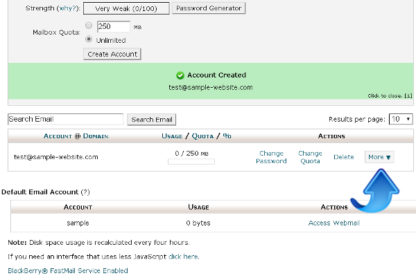 Click on the "More" menu, as shown with the blue arrow in the screenshot above. The screenshot above actually shows the screen right after creating the email address "test@sample-website.com", with the email account confirmation message, and then right below that the list of email accounts including the one just created.